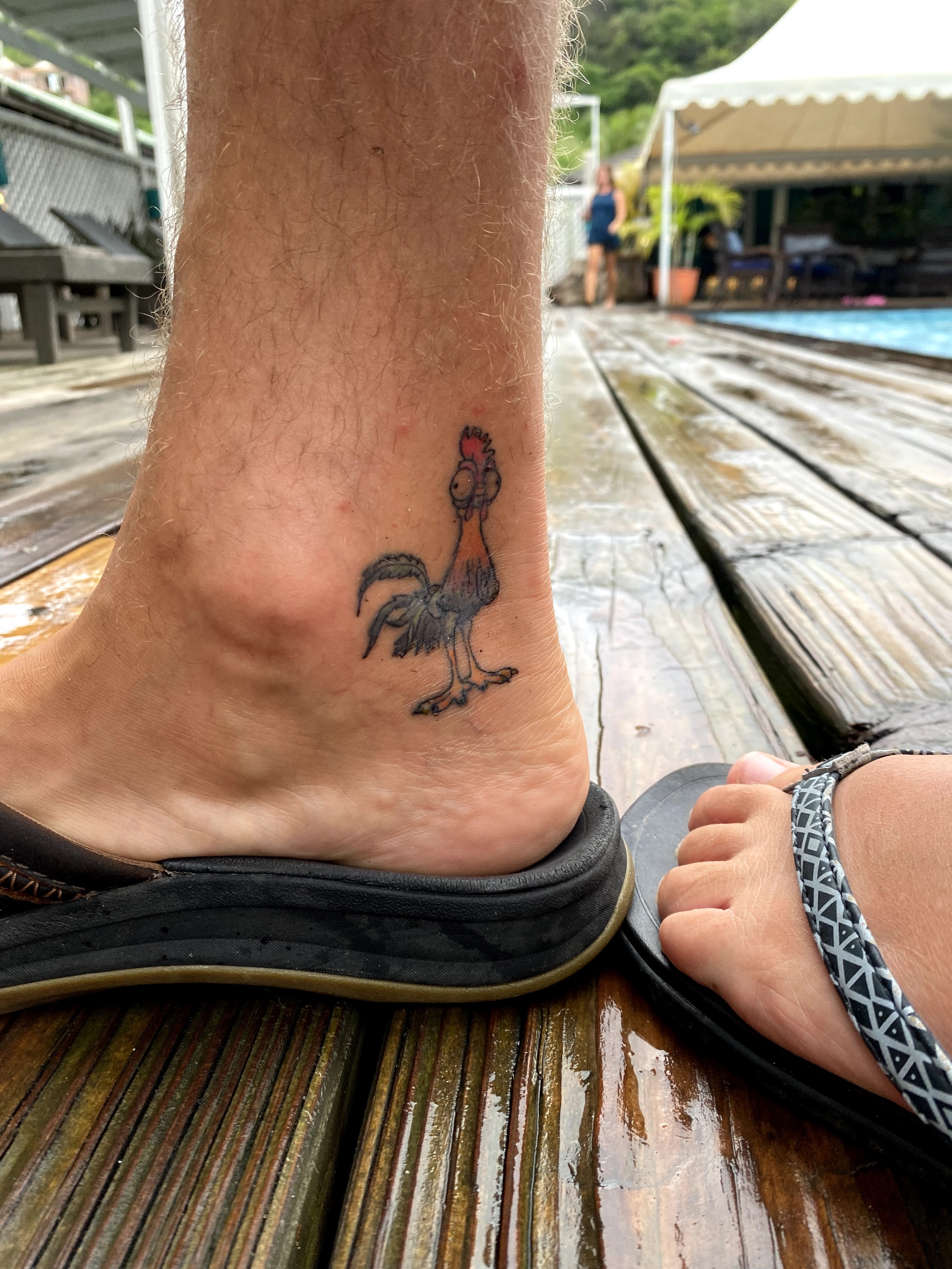 We are having the best time! Exploring, listening to live music, karaoke on Friday nights and learning to be the driver on the right side of the car and drive on the left side of the road. We also decided to commemorate our adventures with getting a tattoo with friends. Jason got a rooster and a pig, this symbolizes survival at sea.